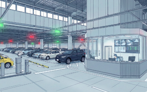 車路上の車両検知や誘導制御により、場内動線を最適化するシステムです。混雑緩和や接触事故防止に加え、大規模駐車場における安全性と運営効率の向上を支援します。