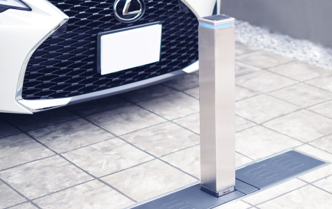 自宅駐車場に設置する電動昇降式ボラード。リモコン操作で車の出入口を物理的に遮断し、無断侵入や車両盗難を防止。後付け設置可能で、景観や使い勝手にも配慮した設計。 -